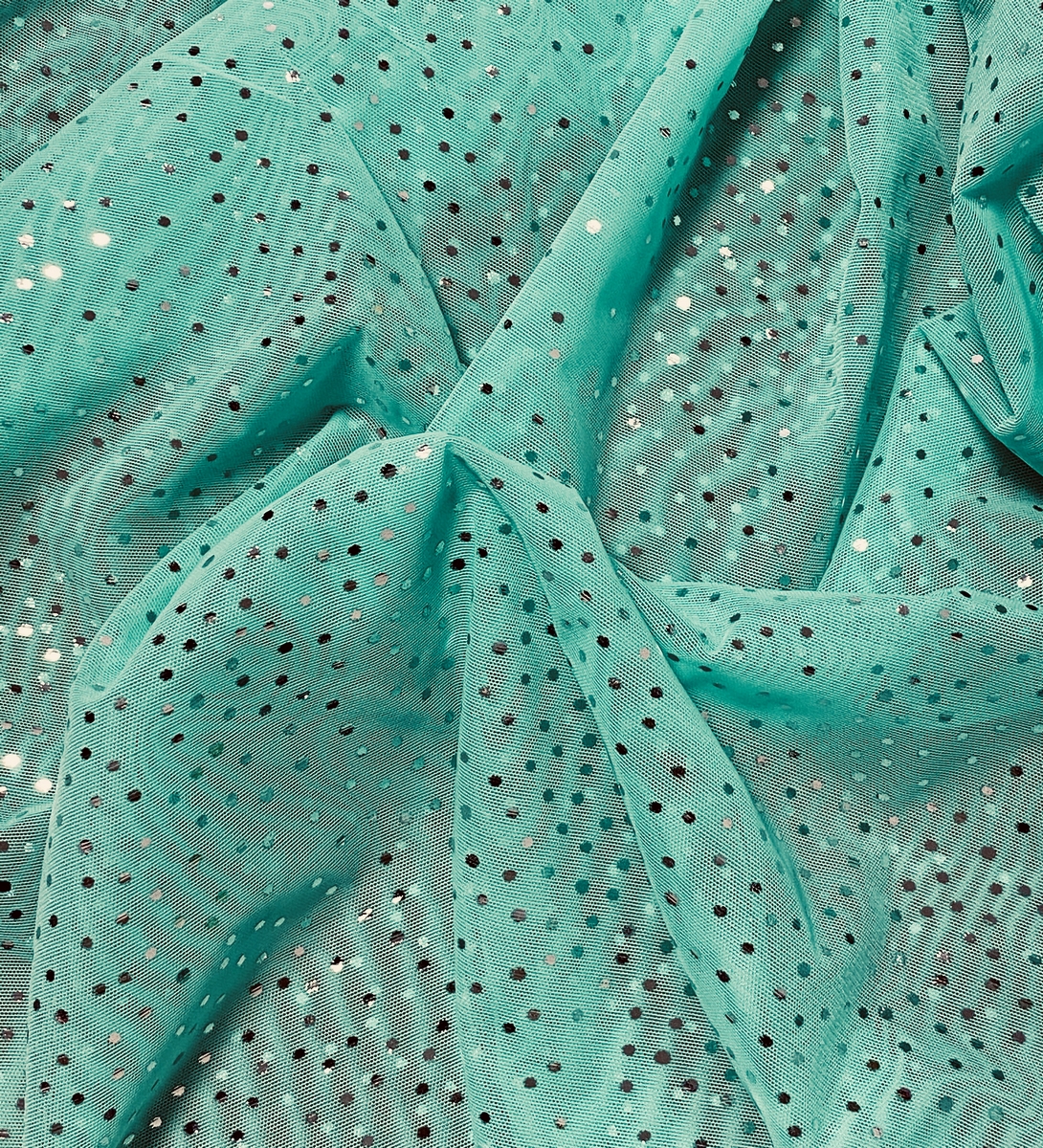 Wysokiej jakości siatka elastyczna włoska w kolorze miętowym o gęstych oczkach, zdobiona srebrnymi kropeczkami. Nie wymaga zdobienia. Tkanina na stroje taneczne, do akrobatyki, na stroje gimnastyczne, na stroje disco dance, zwiewne sukienki do jazz dance.