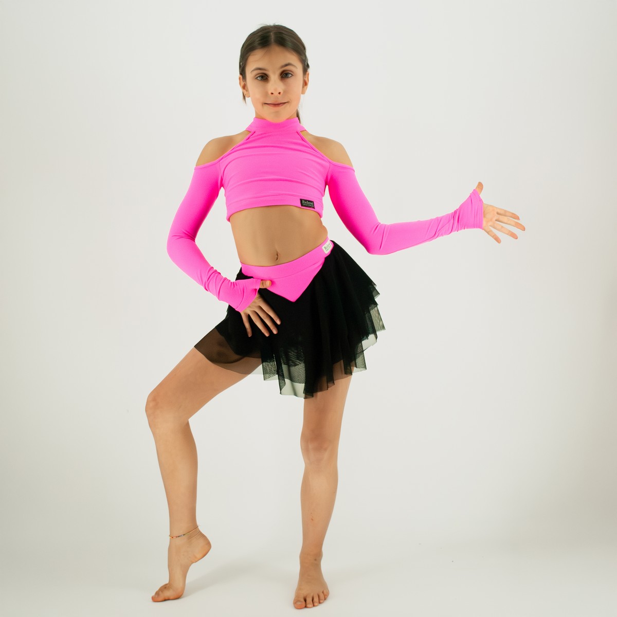 Spódniczka taneczna została zaprojektowana z myślą o młodych tancerkach, które chcą połączyć komfort z wyrazistym, scenicznym wyglądem. Intensywny neonowy różowy pas przyciąga wzrok, a warstwowa, transparentna czarna siateczka pięknie pracuje w ruchu, podkreślając energię choreografii.