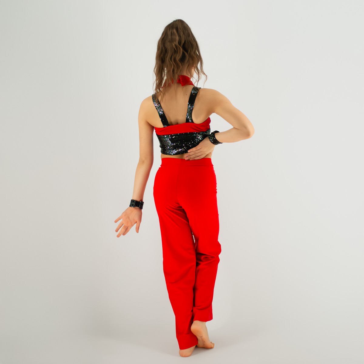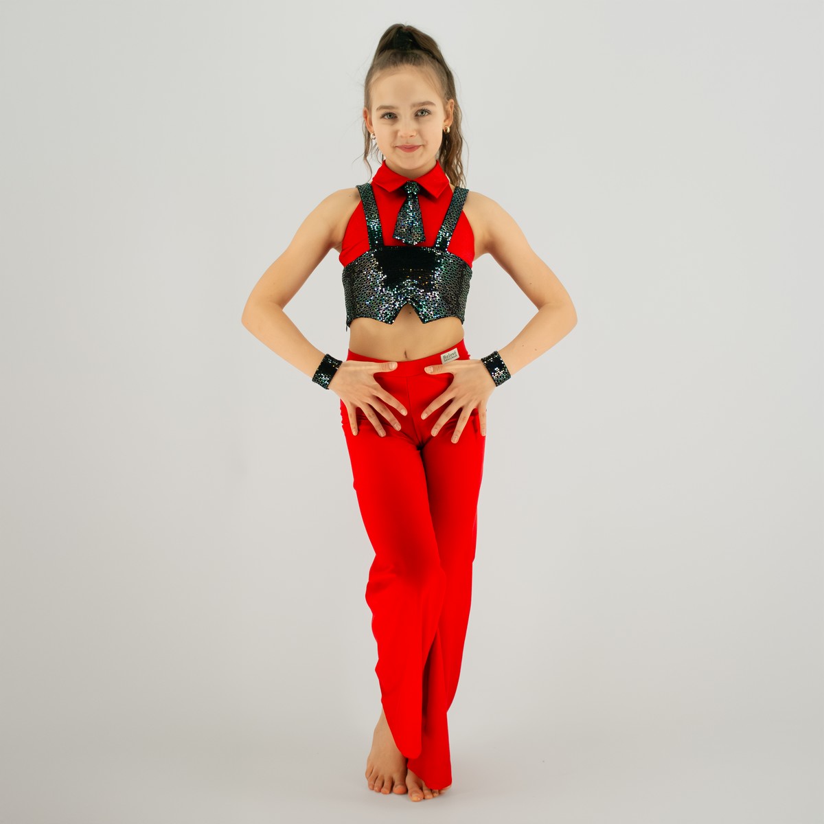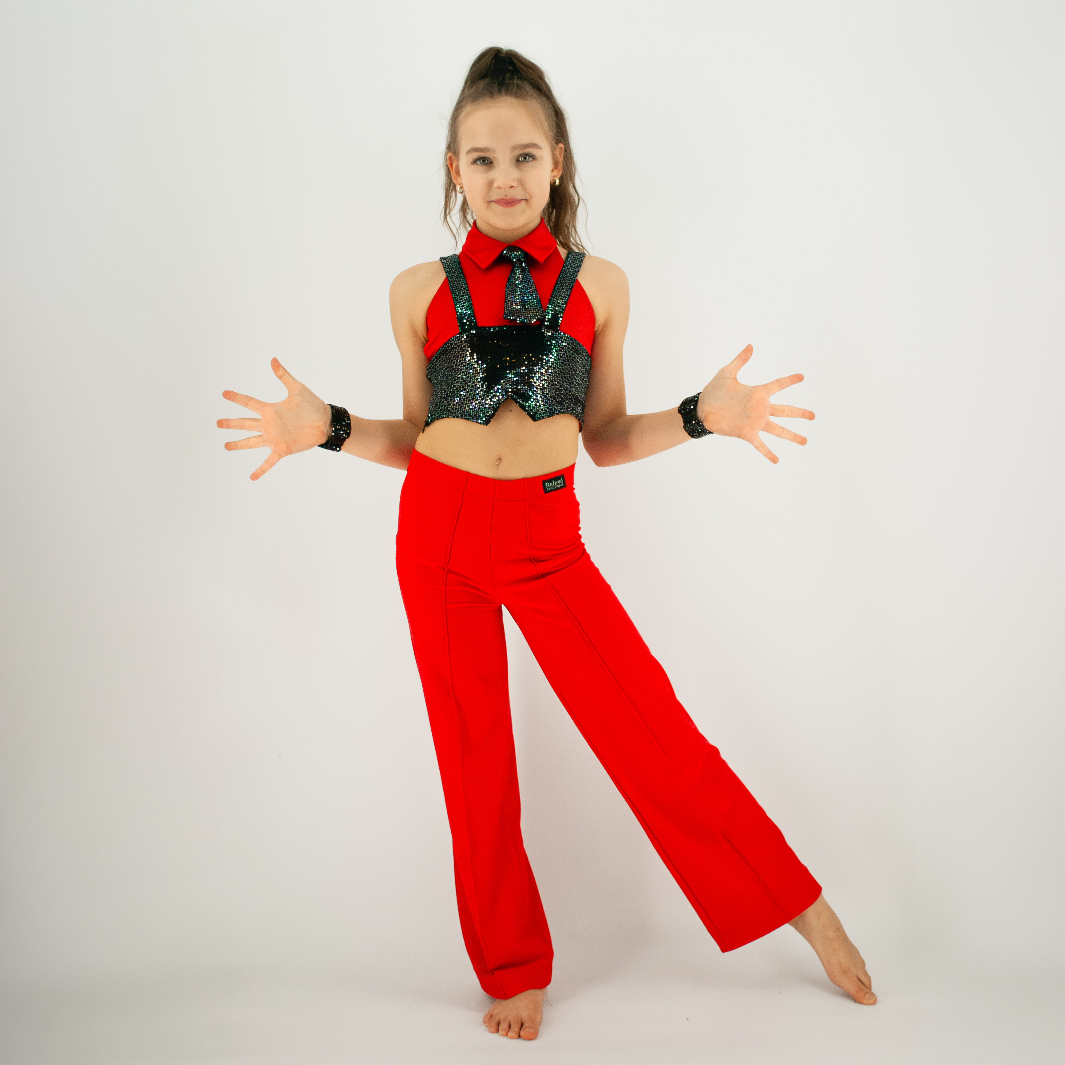 Top taneczny został zaprojektowany z myślą o młodych tancerkach, które chcą przyciągać uwagę na scenie od pierwszego kroku. Intensywna, czerwona kolorystyka w połączeniu z czarną, połyskującą aplikacją tworzy nowoczesny, show-dance’owy look. Wyraźne linie oraz kontrastowe przeszycia podkreślają sylwetkę i nadają całości mocnego, scenicznego charakteru.
