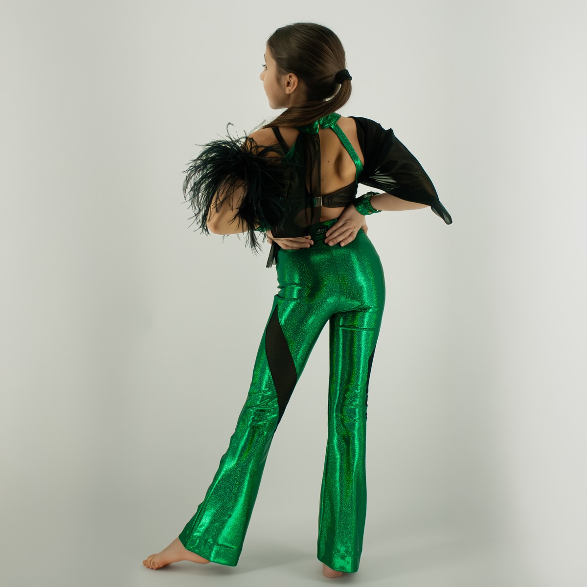 Strój taneczny został zaprojektowany z myślą o młodych tancerkach, które chcą połączyć elegancję z mocnym, scenicznym akcentem. Głęboka, szmaragdowa zieleń w połączeniu z czarnymi detalami tworzy luksusowy, dynamiczny look idealny do show dance, jazz i disco.