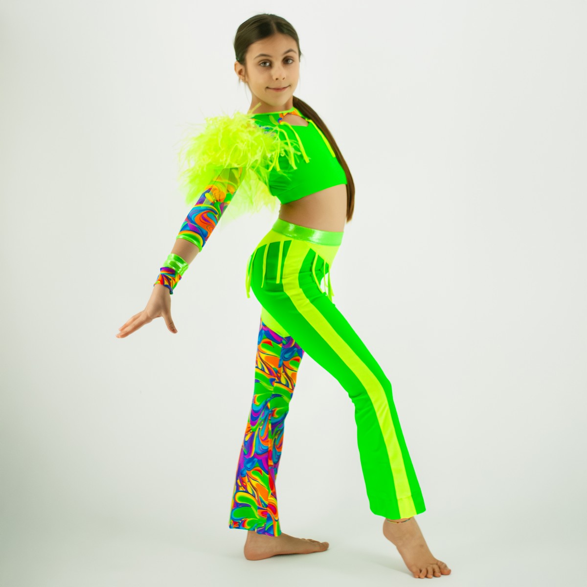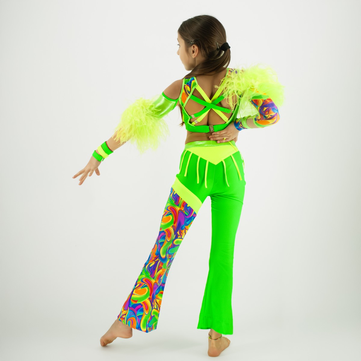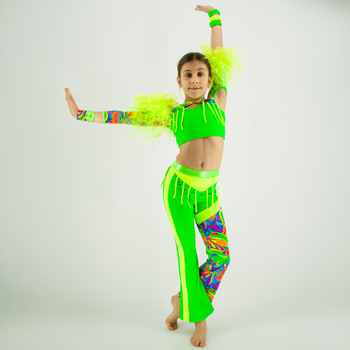 Dziecięcy strój taneczny zaprojektowany z myślą o młodych tancerkach, które chcą błyszczeć na scenie i przyciągać uwagę od pierwszego ruchu. Połączenie matowej, drukowanej, holograficznej lycry z intensywną zieleną tworzy spektakularny, disco-dance’owy look.