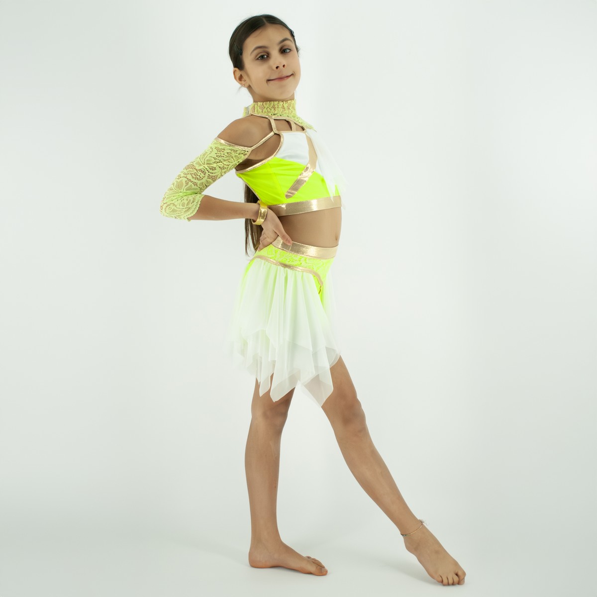 Ten wyjątkowy strój taneczny to połączenie świeżej, neonowej energii z delikatnością i elegancją formy. Intensywny odcień neonowej żółci zestawiony z bielą oraz złotymi, połyskującymi akcentami tworzy nowoczesny, sceniczny look.