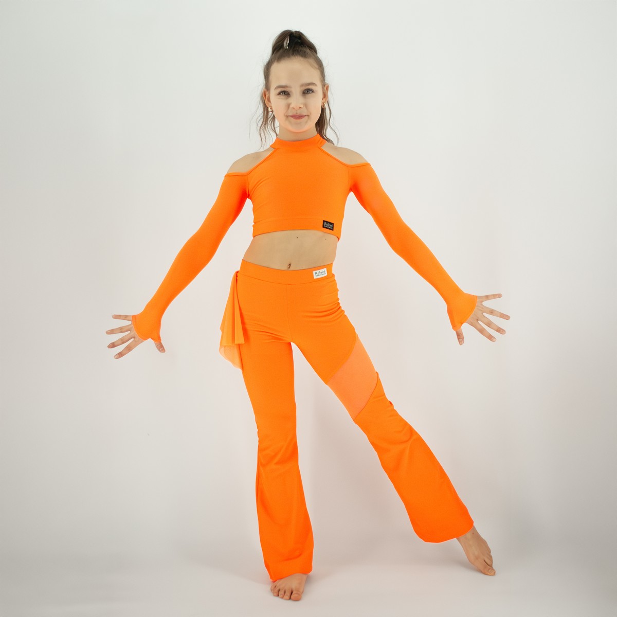 Efektowne spodnie taneczne stworzone z myślą o maksymalnej wygodzie i scenicznej prezencji. Intensywny pomarańczowy kolor podkreśla energię choreografii i idealnie komponuje się z topami w stylu scenicznym.