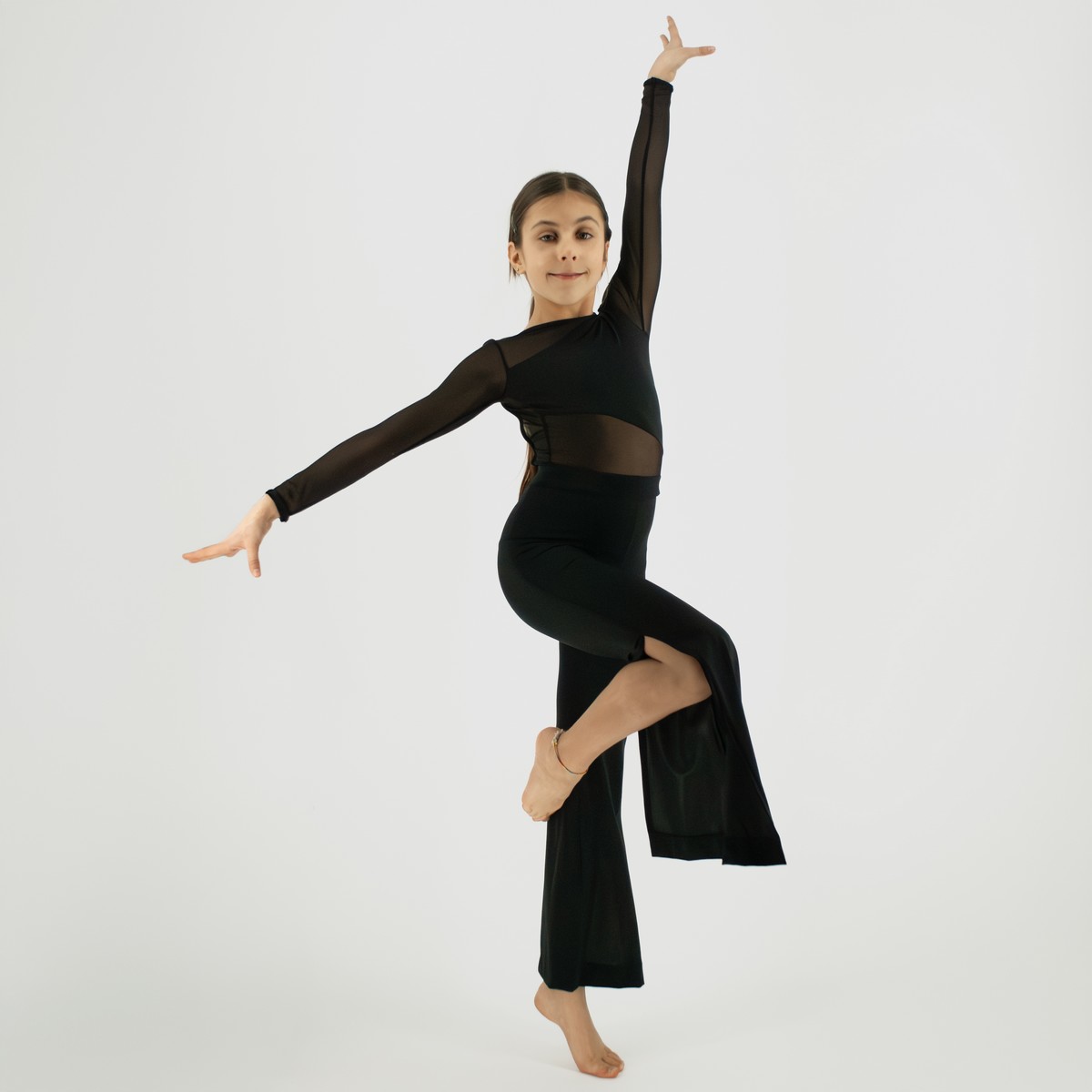 Nowoczesny strój taneczny to propozycja dla młodych tancerek, które cenią minimalizm, linię ruchu i elegancką prostotę. Głęboka czerń w połączeniu z geometrycznymi wstawkami z transparentnej siateczki subtelnie podkreśla sylwetkę i pracę ciała, tworząc efekt wyrafinowanej scenicznej lekkości.