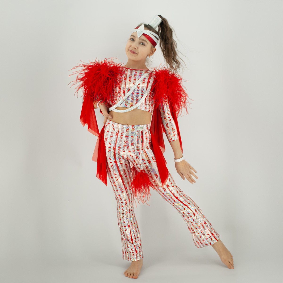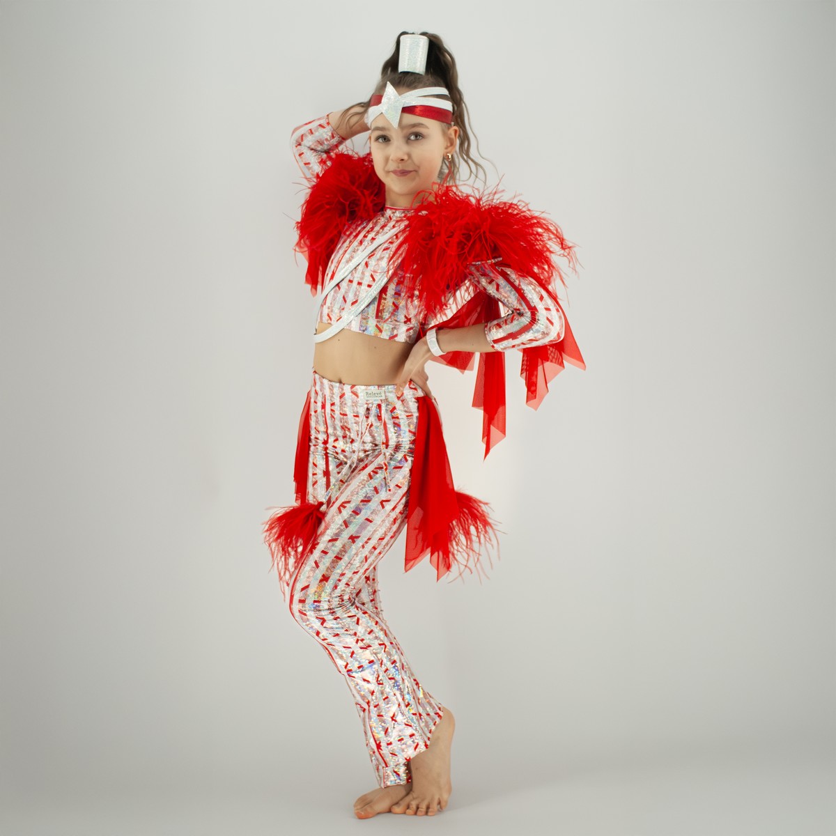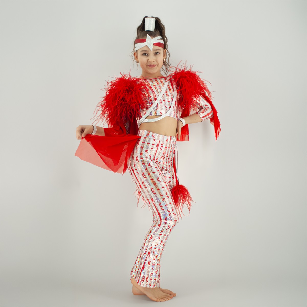Ten efektowny strój taneczny został zaprojektowany z myślą o młodych tancerkach, które chcą błyszczeć na scenie i przyciągać uwagę od pierwszego ruchu. Połączenie srebrnej, holograficznej lycry z intensywną czerwienią tworzy spektakularny, disco-dance’owy look.