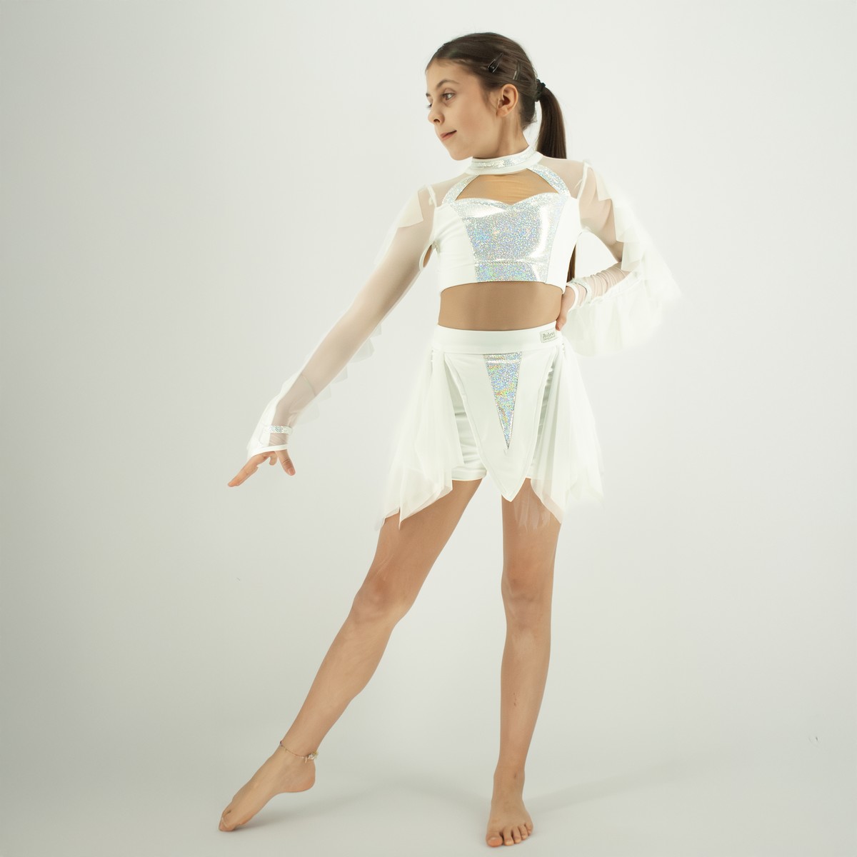 Piękny kostium sceniczny stworzony z myślą o choreografiach slow disco, podkreślających płynność ruchu i subtelną ekspresję. Główną bazę stanowi czysta biel, połączona z holograficznymi wstawkami, które pięknie odbijają światło i nadają całości lekko futurystycznego, scenicznego charakteru.