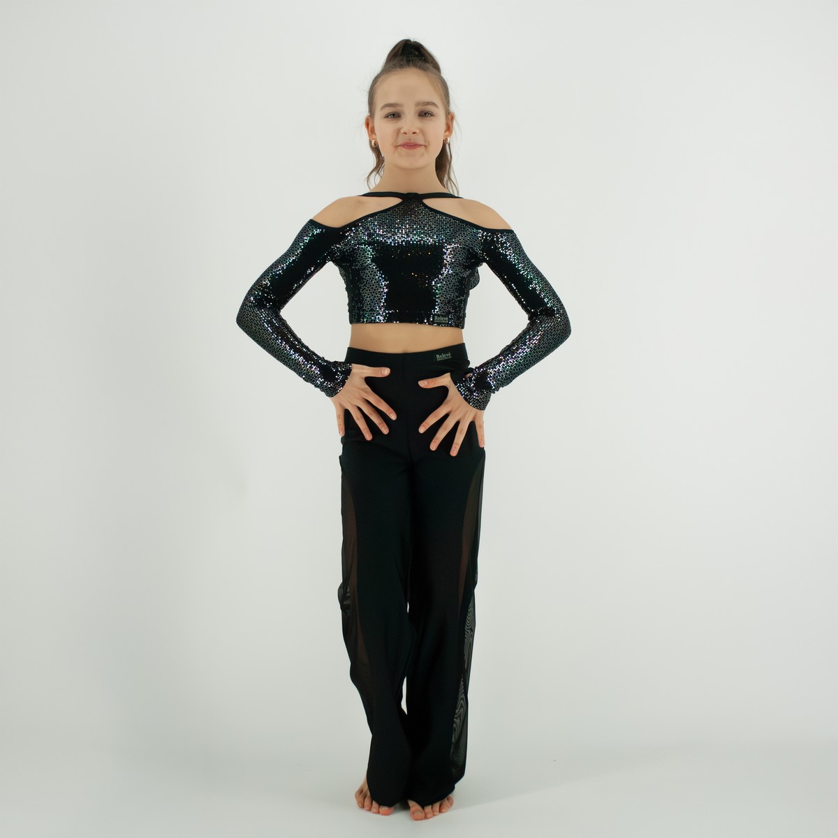 Efektowny top taneczny o nowoczesnym, scenicznym charakterze, zaprojektowany z myślą o wyrazistej prezentacji ruchu. Wykonany z elastycznej, czarnej tkaniny w całości pokrytej drobnymi, wielobarwnie mieniącymi się cekinami, które pięknie odbijają światło podczas tańca.