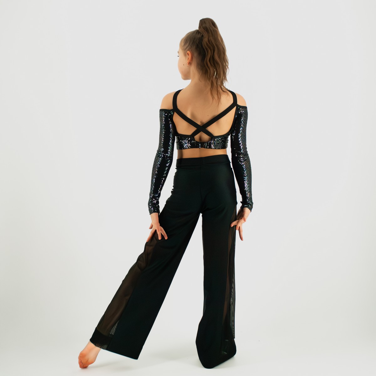 Tył topu przyciąga uwagę skrzyżowanymi, elastycznymi paskami, które tworzą dekoracyjny detal i zapewniają dobre dopasowanie oraz stabilność podczas dynamicznych choreografii. Długość topu eksponuje talię, idealnie komponując się ze spodniami z wysokim stanem.